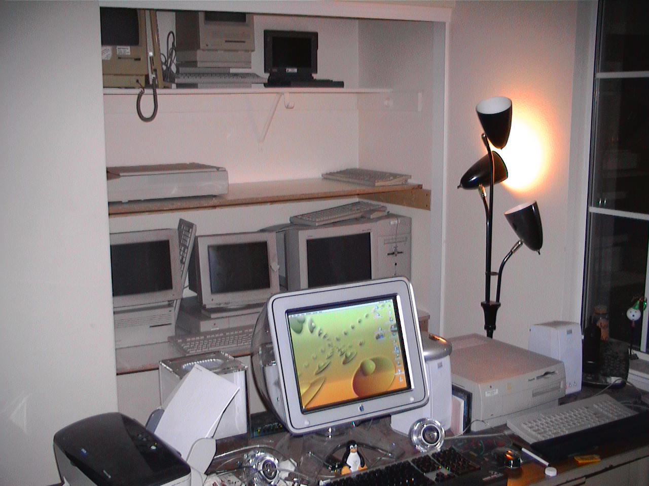 So I finally got the Zio working (by booting in OS 9) and took this shot of the new computer setup. I still have two more computers to load up, and I also have to hook everything up, but the museum is almost ready to go.